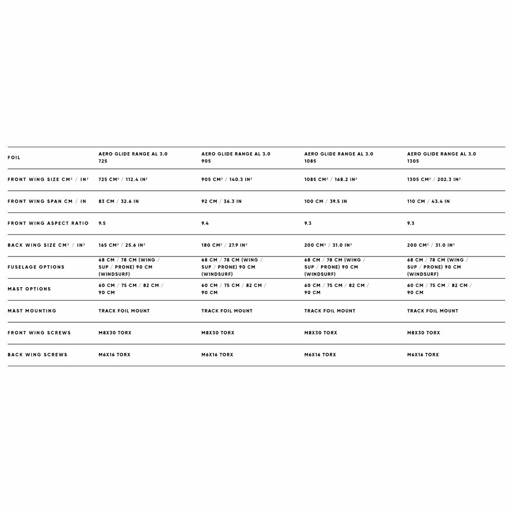 Aero Glide 725 : Aile avant 725 / Stabilisateur 165 GL Rapide et agile, pour les pratiquants légers et les foilers de niveau confirmé jusqu’à environ 85kg. Aime aller vite !