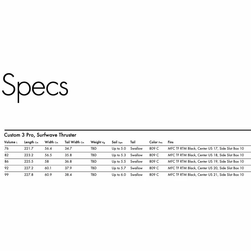 Son outline parallèle offre un passage rail to rail facile et performant. Le nouveau profil plus mince augmente la puissance et le confort tout en améliorant l’équilibre et la plage d’utilisation. En Joignant le format Thruster avec une carène V / Double concave et un outline parallèle, la Custom 3 Pro réuni le classique tri fin combo avec un shape progressif et moderne.