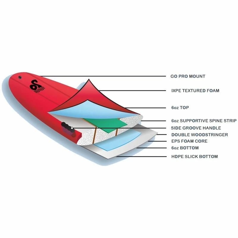 Bien qu’accessible cette board dispose d’une conception et d’une construction qui permettra d’offrir une marge de progression. En effet elle dispose d’une couche d’epoxy de 6Oz pour une plus grande durabilité et une meilleure réactivité dans les vagues rapides. Elle est également équipée de deux stringer bois qui parcourent la board du nose au tail afin d’en augmenter la rigidité et la solidité pour obtenir une meilleure sensation et une meilleure solidité.