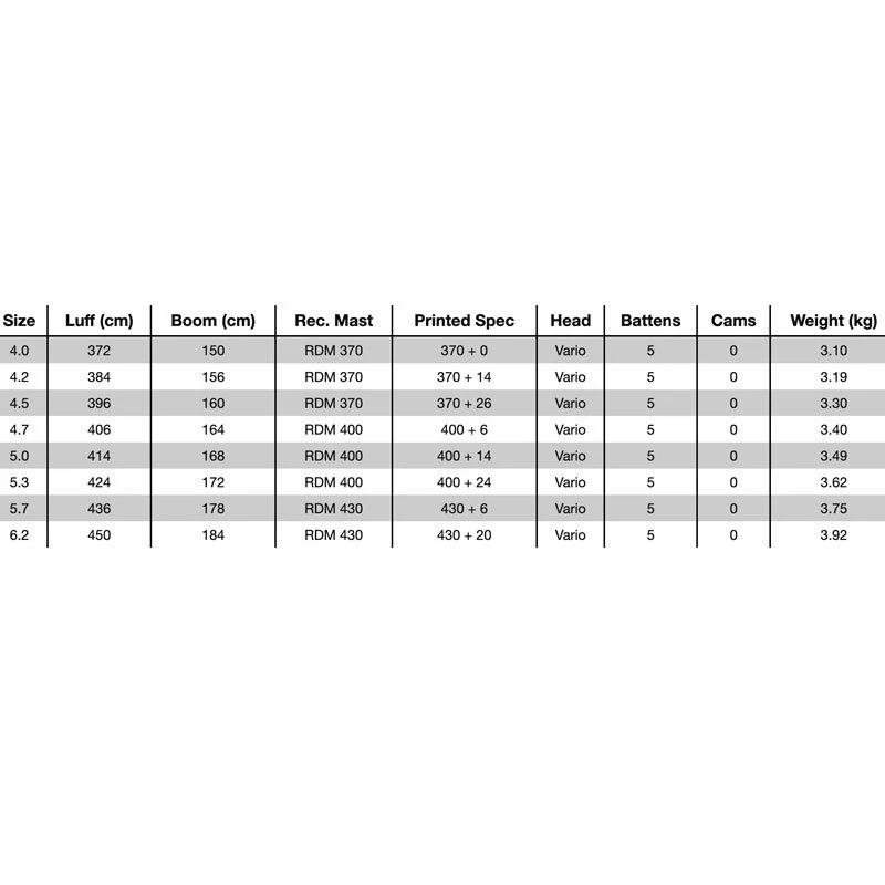 - Taille 5.0 – Luff 414 cm – Boom 168 cm – Rec Mast RDM 400 – 400 + 14 – Head Vario – Battens 5 – Cams 0 – 3.49 kg