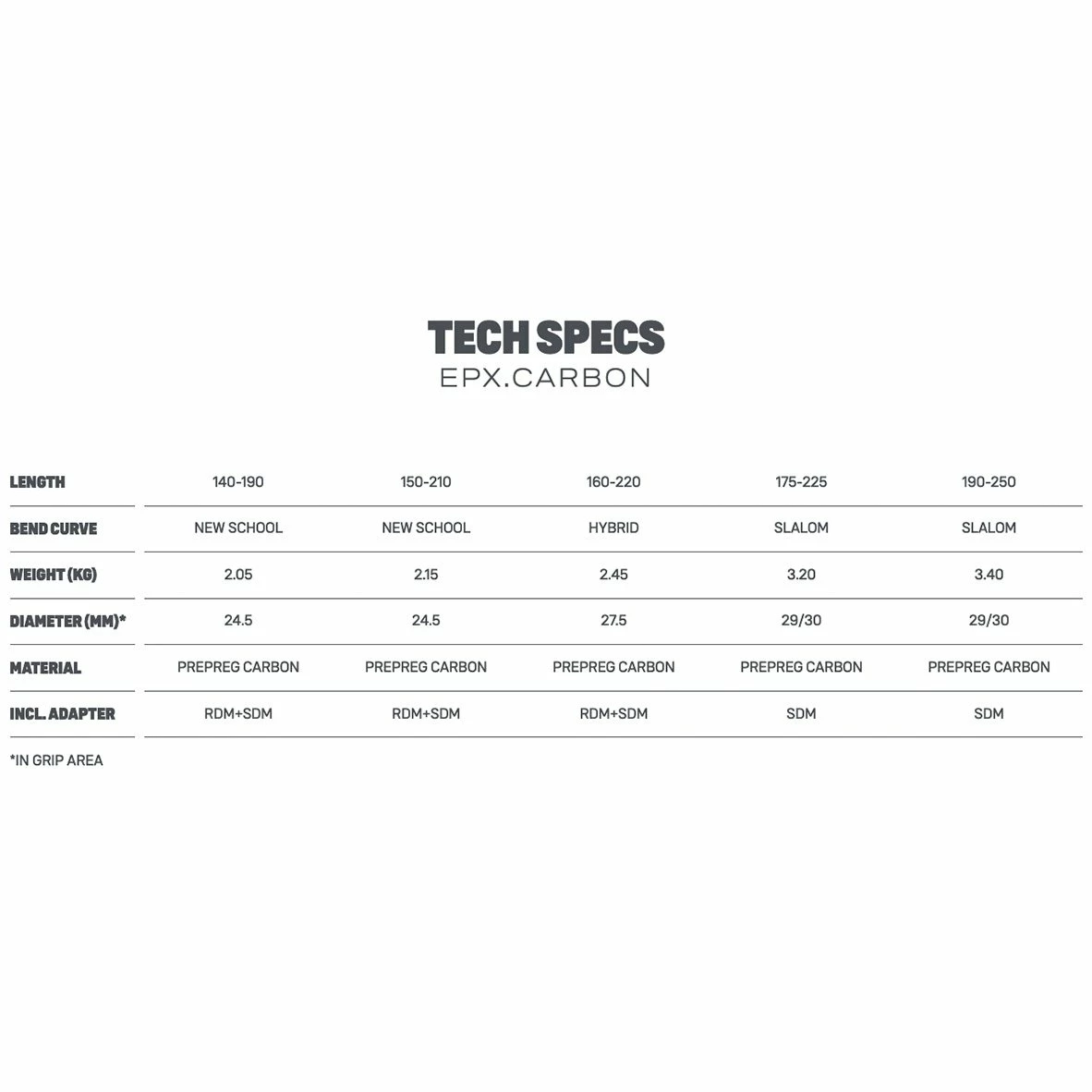 - Slalom > Formula (175/190): Longueurs 175 et 190 cm avec tubage ovale 29/30 mm, courbure de race/slalom pour grandes voiles de slalom/race